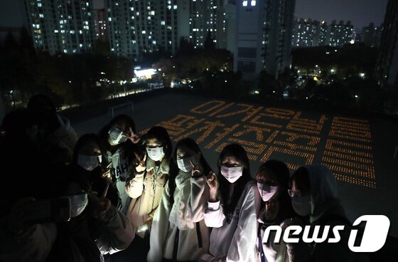 고3 수험생들이 운동장에 LED 불빛으로 쓰여진 수능응원 문구를 배경으로 사진을 찍고 있다. 운동장에 쓰여진 응원 문구는 '이겨온날들 펼쳐질꿈들'이다. 2022.11.10/뉴스1 © News1 임세영 기자